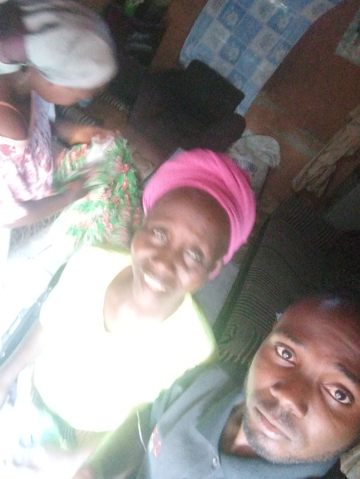 The image displays four individuals inside a residential setting in Kachia, Nigeria. In the foreground, a man with dark skin and a beard is partially visible on the right, looking directly at the camera while wearing a dark polo shirt. To his left, a woman with dark skin, wearing a bright yellow t-shirt and a pink headwrap, smiles at the camera. In the upper left quadrant, a second woman, wearing a light-colored headwrap and a patterned pink and white top, is shown looking downward, attending to a child in a green and floral patterned garment, who is mostly obscured. The background includes a blue and white patterned fabric, dark, indistinct items, and a white sack. The environment suggests an indoor space with reddish-brown walls and bright illumination from the left.
