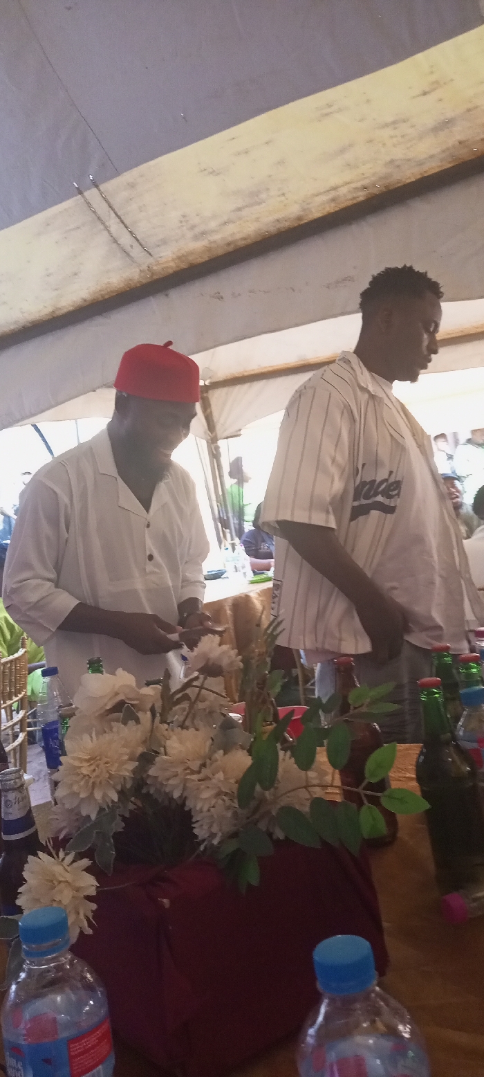 This image depicts a social gathering occurring under a white tent structure in Nnewi, Nigeria. In the mid-ground, two dark-skinned males are visible. The male on the left wears a white long-sleeved shirt and a red traditional Igbo cap; he has a beard and is smiling while holding a small white object in his hands. The male on the right wears a white and striped short-sleeved shirt with the word "Inde" partially visible on the chest; he has short, dark hair and stands with his right hand in his pocket. The foreground features a wooden table partially covered with a maroon fabric, centrally adorned with an arrangement of cream-colored artificial flowers and green foliage. Various beverages are placed on the table: multiple clear plastic water bottles with blue caps, several brown glass bottles with green caps, and one dark-colored glass bottle. In the blurred background, other individuals are visible, including one figure wearing green attire. The ceiling of the tent, composed of white fabric and supported by a horizontal beam, is visible in the upper portion of the frame, along with thin wires or ropes. A gold-colored chair is partially visible on the far left.
