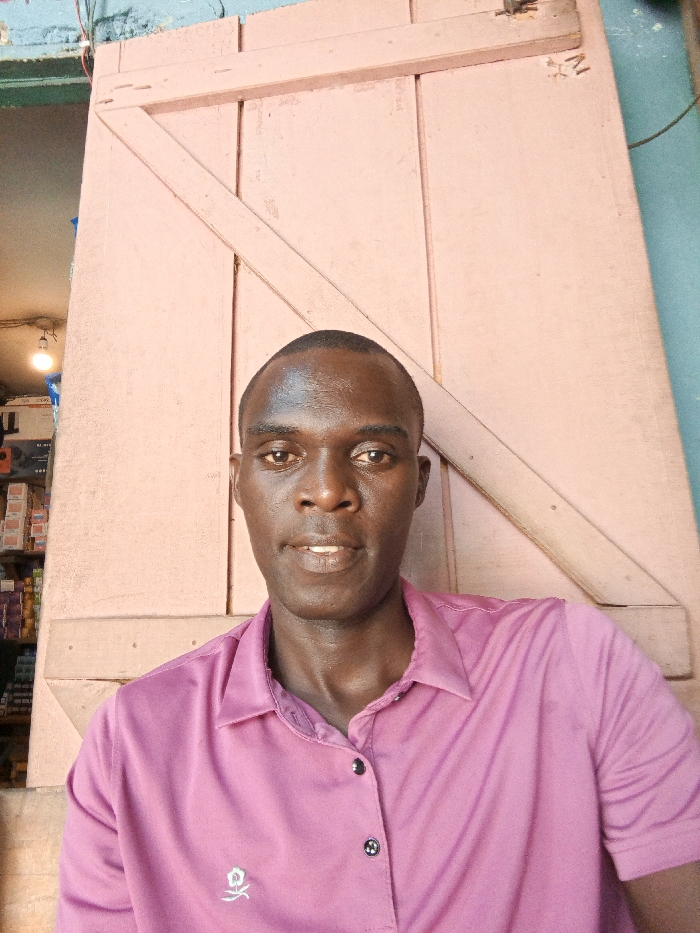 An adult male with dark skin and short dark hair is depicted in a chest-up portrait, facing the camera with a neutral expression and slightly parted lips. He is wearing a fuchsia-colored, short-sleeved, collared polo shirt with three black buttons on the placket and a small white embroidered emblem on the left chest. The scene is set in the city of Unknown, Unknown. Behind the man, a light pink or faded red wooden door with a diagonal brace and a metal latch on the upper right side occupies the right background. To the man's left, an open doorway reveals a dimly lit interior space featuring multiple shelves stocked with various packaged goods and a single incandescent light bulb emitting a yellow glow from the ceiling. A thin, dark cable runs horizontally across the upper left portion of the frame. The wall to the far right is a light blue color.