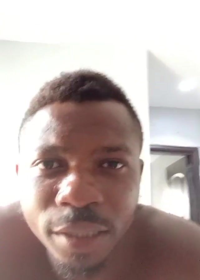 A close-up shot shows the upper torso and face of a dark-skinned man. He looks directly at the camera and speaks. He is shirtless. He then raises a hand and scratches the top of his head. The background appears to be a white wall.