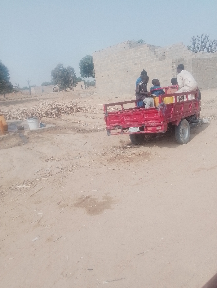 The image depicts a rural or semi-urban scene in Kanwa, Nigeria, under clear, bright daylight. The foreground consists of light brown, dry, dusty earth with some faint tire tracks and scattered debris. In the midground, a red three-wheeled motorized vehicle, appearing to be a cargo tricycle with a bed, is positioned slightly off-center to the right. Four individuals, all male, are seated or standing in the cargo bed. One man, wearing a light-colored traditional garment (agbada or similar), stands at the rear of the bed, facing forward. To his left, another man in a dark shirt with light stripes sits. Next to him, a younger individual in a dark blue shirt is seated. A fourth individual, partially obscured, is also visible. Two yellow plastic jerrycans or containers are visible within the cargo bed, near the seated individuals. The vehicle's single rear wheel and a license plate are visible. To the left of the vehicle, on the dusty ground, there is a pile of dry, light-colored wooden sticks or branches, possibly firewood or construction material. A white bucket and a smaller yellow object are near this pile. The background features several structures constructed from light-colored concrete blocks, appearing to be partially built or in disrepair, suggesting a construction site or an undeveloped area. Several sparse trees with green foliage are scattered across the horizon, with the sky being a pale blue, almost white, indicating either haze or bright sunlight.