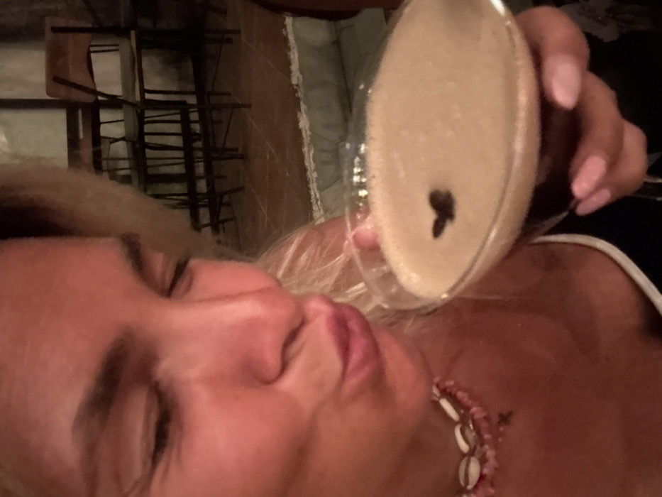 A blonde individual, identified as female, is depicted holding a cocktail in a martini glass with her right hand. Her lips are pursed as if blowing a kiss, and her eyes are closed or cast downwards. She wears a multi-strand necklace composed of cowrie shells and pink beads. Her fingernails are painted pink. The cocktail contains a dark liquid base topped with a light, frothy foam, garnished with three dark coffee beans. The background is out of focus, revealing several dark wooden chairs with slat backs and a light-colored tiled or concrete floor. The scene is illuminated by warm, dim lighting, indicative of an evening setting. The location is Uluwatu, Indonesia.