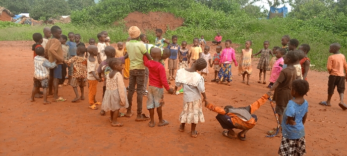 A large group of children stand on a red dirt ground. Many hold hands, forming a circle. Some adults are present amongst the children, also holding hands within the circle. The children wear a variety of casual clothing including dresses, shorts, and shirts in different colors and patterns. In the background, vegetation and some simple structures are visible. The overall scene suggests an outdoor activity or gathering.