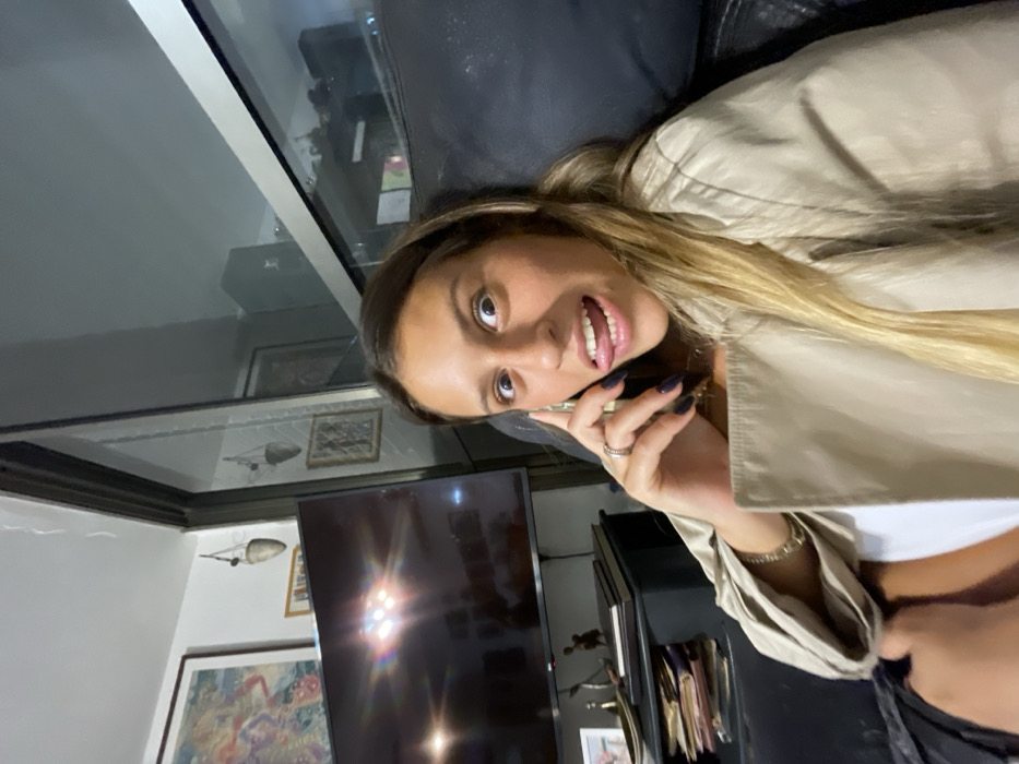 A young female, with long light brown hair and a light complexion, is seated on a dark sofa indoors in the city of Unknown, Unknown. She looks directly at the camera with wide eyes and her tongue slightly extended, exhibiting a playful expression. She holds a dark smartphone to her right ear with her right hand, which has dark nail polish and two rings. She is wearing a light-colored (beige/tan) jacket over a white top. In the background, a large flat-screen television is visible to the left, reflecting bright light sources. Below the TV is a dark console holding books and other objects. On the wall to the left, a framed, colorful textile artwork hangs, and two decorative wall-mounted vessels are present further to the right. A large window or glass door on the right side of the image reflects interior elements and a dark exterior.