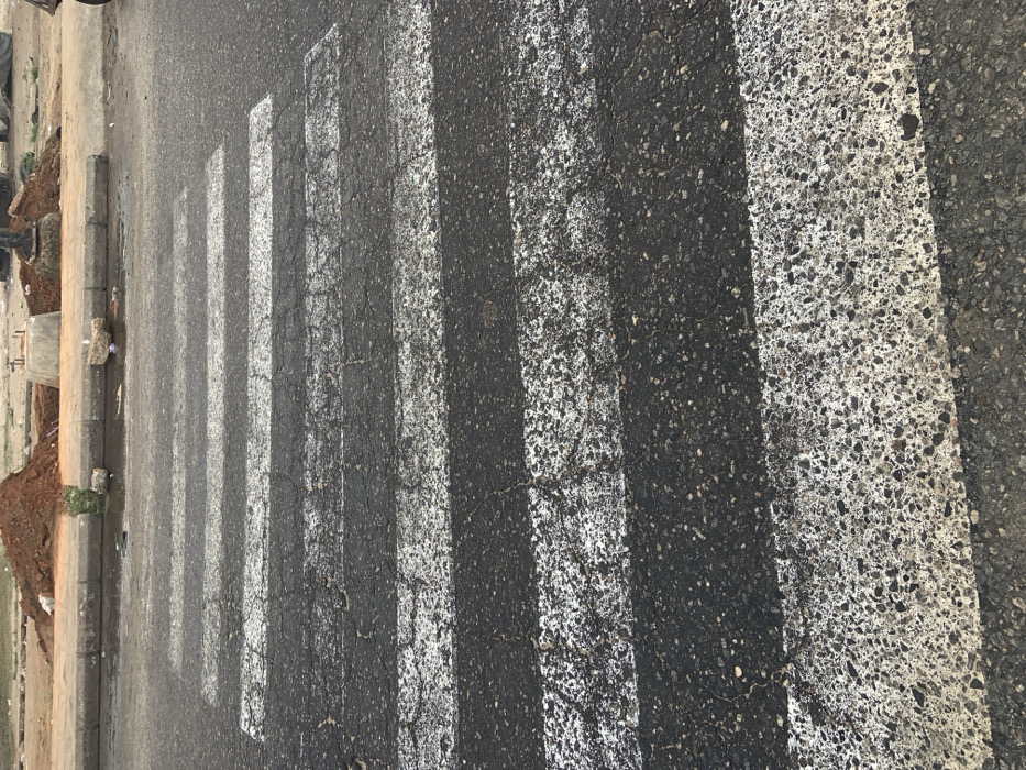 section of asphalt road marked with a pedestrian crosswalk. White stripes are painted across the dark asphalt, creating a contrasting pattern. The road surface shows signs of wear and cracking. A concrete curb runs along the left edge of the road, bordering a patch of dirt and vegetation. The image is shot from an elevated perspective, giving a slightly tilted view of the crosswalk.