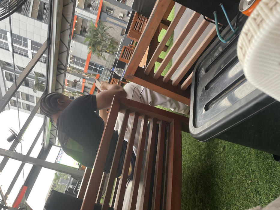 A man with braided hair wearing a black shirt sits at a wooden table, looking at his phone. Behind him is a building with many windows. A bottle of water sits on the table. A black container with blue tubing is next to the table. Part of a white shirt is visible next to the man. Artificial turf is visible beneath the furniture. The photo is taken at an angle, tilting the view of the building and table.