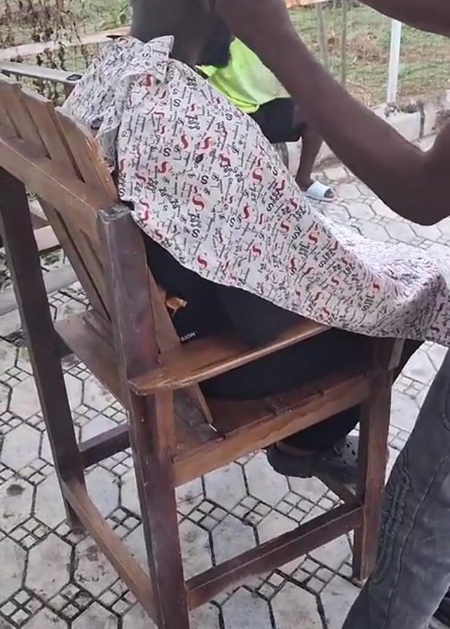 A man sits in a wooden chair, draped with a patterned barber’s cape, while another man, the barber, stands behind him, using a gold-colored electric hair clipper to cut his hair. The barber wears gray jeans and black sandals. A second man, wearing a bright yellow shirt, sits further away in the background. The scene takes place outdoors on a tiled patio area. A second chair sits in the background, next to the first.