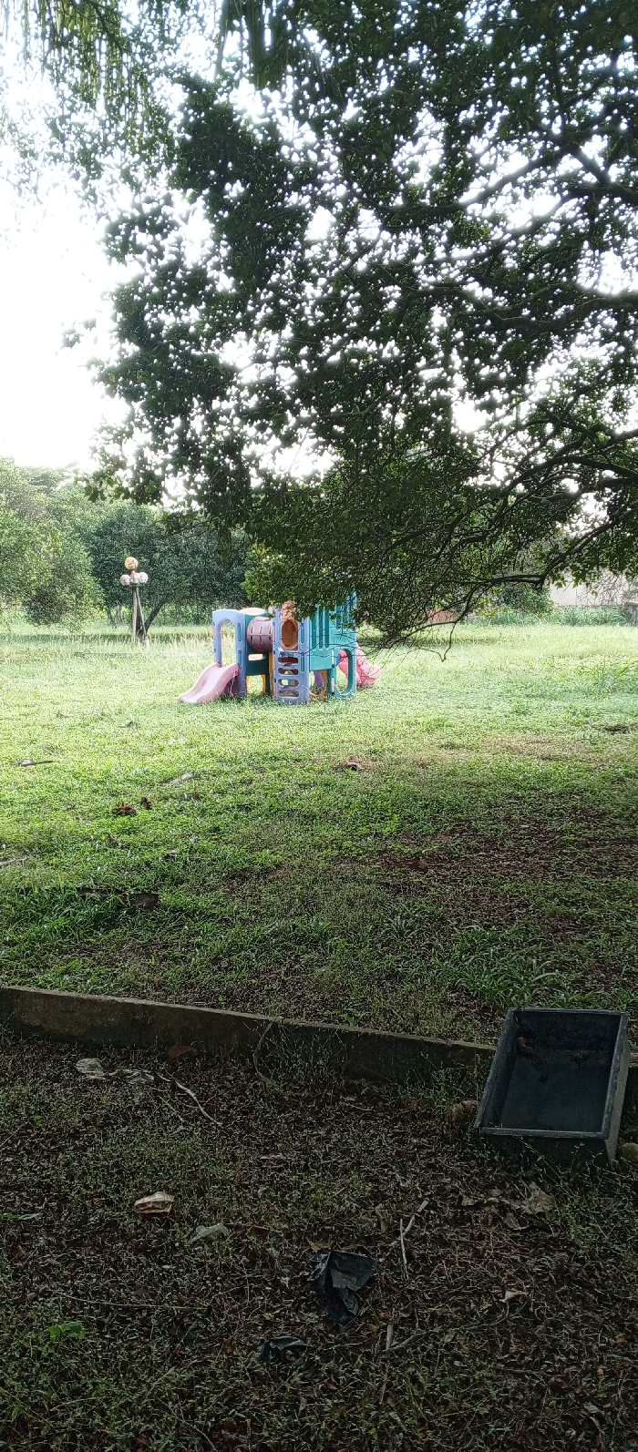 The image depicts an outdoor, grassy area in Unknown, Unknown, under bright, dappled daylight. A multi-colored plastic children's play structure is centrally positioned on a field of green, unkempt grass. The play structure is predominantly blue and grey, featuring two pink slides (one on the left, one on the right), a ladder, and various platforms. In the immediate foreground, the ground consists of sparse grass, exposed soil, and scattered organic debris, including fallen leaves and small pieces of litter. A concrete curb or low barrier extends horizontally across the lower section of the frame. To the lower right, a dark, rectangular plastic container, possibly a tray or planter, is visible on the ground. The midground is dominated by the grassy field. In the mid-left background, a tall, slender wooden pole topped with three spherical, light-colored decorative elements stands. The background consists of a dense line of trees and foliage. A light-colored structure, possibly a building or wall, is faintly visible behind the trees on the far right. Overhead, dense tree branches with green foliage extend across the upper portion of the frame, allowing bright patches of sunlight to filter through. No individuals or active subjects are present in the scene.