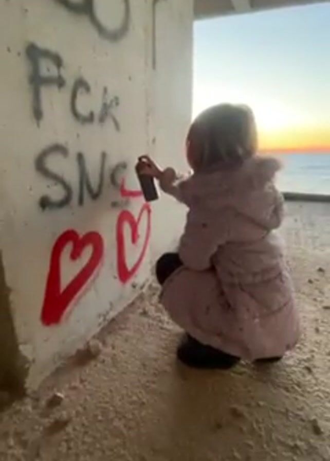 child squatting next to a white concrete wall, spray-painting it with red paint. The wall already has existing graffiti in black and red, including the words "FCK SNS" and two red hearts. The child is wearing a light purple, hooded winter coat and black shoes. The background shows a body of water, a sky with a light orange glow, and a concrete ceiling above. The floor is also concrete. The child adds a red smiley face to the wall above the hearts.