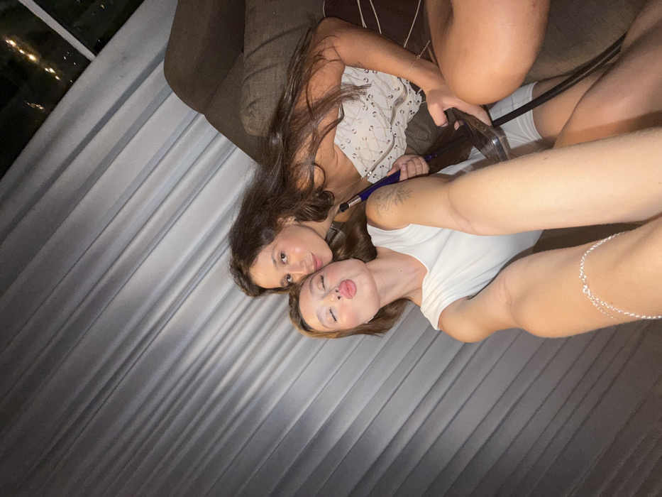 This image displays two young adult females posing for a selfie indoors at night in Unknown, Unknown