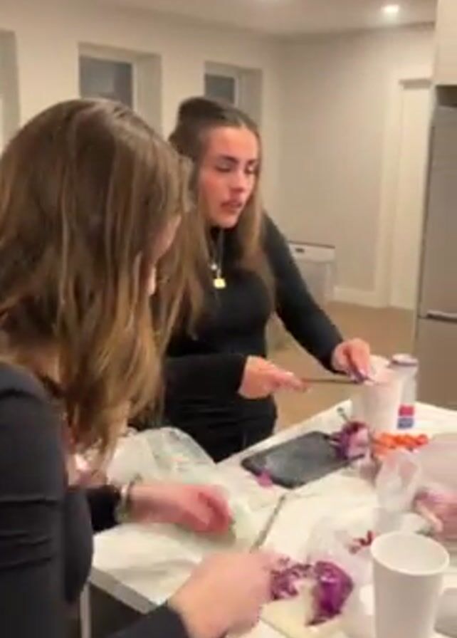 group of young adults in a modern home. The initial shots are of a kitchen where several women are preparing food, including chopping vegetables. The kitchen features light-colored cabinets and countertops. Then, the camera pans to a living room area where a few people are sitting on a large gray sectional sofa. They are drinking beverages and watching something on a phone. There are snacks on the coffee table. The overall atmosphere seems casual and social.