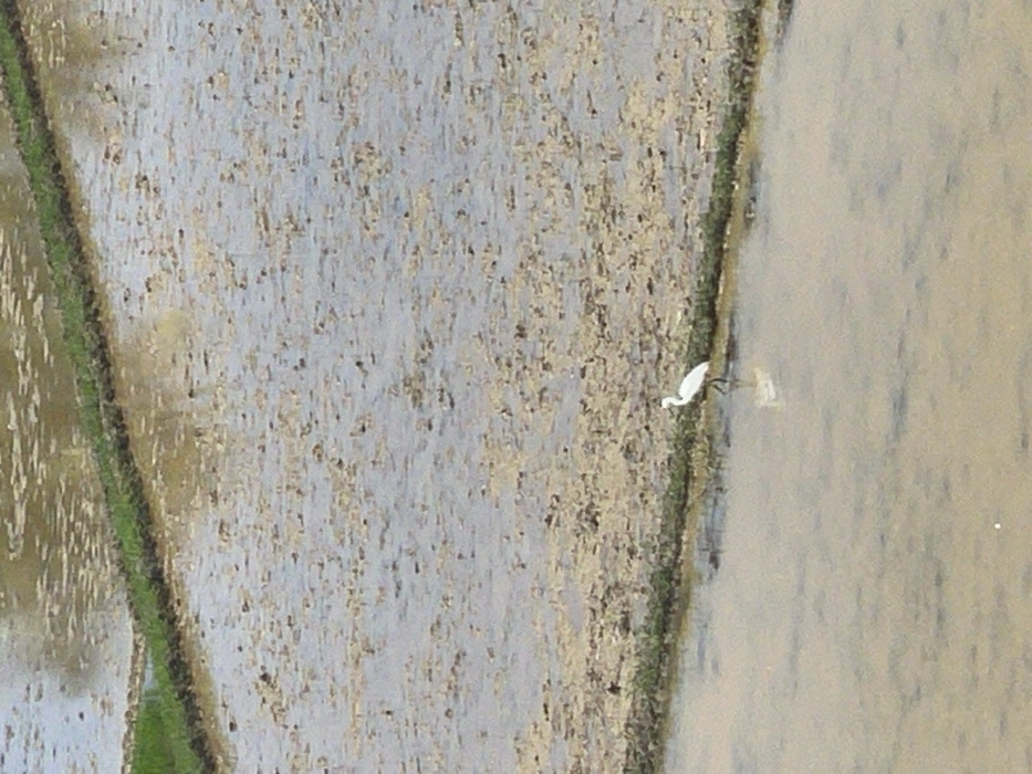 Mns Asan, Indonesia: An outdoor, eye-level photograph captures a flooded agricultural field, likely a rice paddy. The scene is dominated by shallow, muddy water covering uneven ground, interspersed with darker clumps of soil or vegetation. Narrow, raised earthen dikes, partially covered with green growth, divide the watery expanse into distinct sections, extending diagonally and horizontally across the frame. A single white bird, consistent with an egret, is positioned in the lower-middle, standing on the edge of a dike or in very shallow water, facing left. Its reflection is visible in the calm water directly below it. The sky, or an unseen light source, reflects softly on the water's surface.
