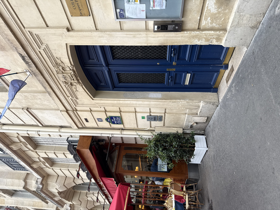 The image displays a street scene on Rue Saint-Benoît, Paris, France, specifically at building number 18. The scene is dominated by two adjacent building facades and a section of sidewalk. On the right, a cream-colored stone building exhibits a prominent, dark blue double door with intricate paneling and gridded windows. Above the door, an ornate stone carving is visible, and two flags, one blue (European Union) and one red (French), are mounted. To the right of the door, a plaque identifies "COLLÈGE JACQUES PRÉVERT." A metal bulletin board containing various papers and a silver intercom system are affixed to the wall next to the door. The street address "18 RUE SAINT-BENOÎT" is clearly indicated on a blue and white sign, and a green square sign with an arrow and the text "J PARIS" is also present. To the left, an adjacent establishment, identified as a cafe or restaurant, features a red retractable awning extended over an outdoor seating area. The cafe has a wooden-framed glass storefront with interior lights illuminated. Several wicker-style chairs are arranged around tables with blue tablecloths on the asphalt pavement. Faint figures of people are discernible inside the cafe through the glass. Between the dark blue door and the cafe entrance, a white rectangular planter contains a tall, leafy green plant. The ground consists of dark gray asphalt pavement. No other individuals or vehicles are visible on the sidewalk or street.