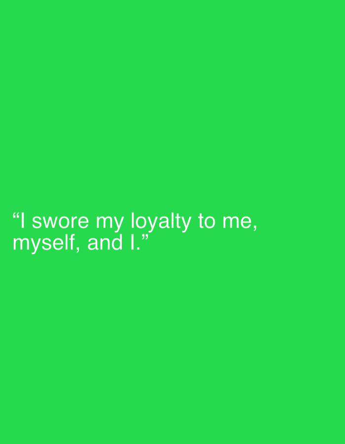 The image displays a vertically oriented, solid green background, specifically a bright lime green shade. White, sans-serif text, enclosed in double quotation marks, is positioned in the lower-left quadrant. The text reads: "“I swore my loyalty to me, myself, and I.”" No individuals, additional objects, specific actions, or interactions are depicted. The environment is uniform, suggesting a digital display or a plain, monochromatic surface. The location in the city of San Sebastián de Aparicio, Mexico, cannot be determined from the visual information provided.