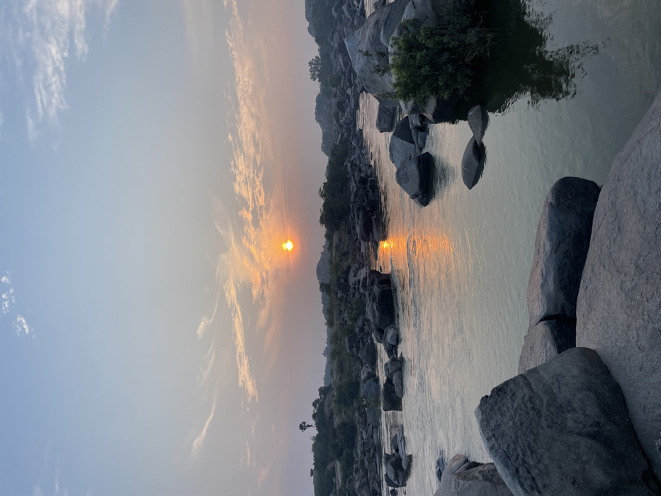 This image depicts a wide view of a rocky river landscape in Hale Bandi Harlapura, India, under the conditions of either sunrise or sunset