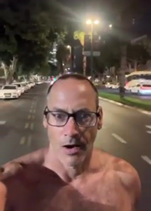 A shirtless, light-skinned man with glasses is holding the camera at arm's length, filming himself outdoors at night