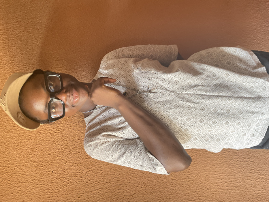 A single individual is depicted in a medium shot, positioned against an uniformly textured, terracotta-colored wall. The individual wears a light-colored baseball cap reversed on their head, large black-framed rectangular glasses, and a light-colored, short-sleeved top with a geometric diamond open-weave pattern. A silver-colored chain necklace with a cross pendant is visible. The right hand is positioned with fingers supporting the chin. The individual exhibits a slight smile with glossy lips. Dark lower garments are partially visible. The scene is brightly lit. The specified location is Ajara, Nigeria.