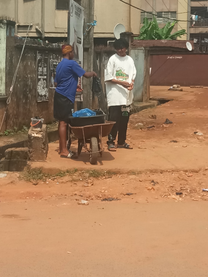 The image depicts an outdoor street scene in Onitsha, Nigeria. Two individuals are present on a raised concrete curb alongside a reddish-brown dirt road. On the left, an adult individual, wearing a blue short-sleeved shirt, black shorts, and black-and-white striped slides, with a patterned headwrap, stands next to a rusty wheelbarrow. This person is seen holding a black plastic bag over the wheelbarrow, which contains a black rectangular basin with a blue plastic bag inside. Next to this individual, a white bucket with a red handle rests on a small concrete block. To the right, a younger individual, wearing a white oversized t-shirt with a green shoe graphic and "CALLED" text, black pants, and black slides, stands facing the first individual. This person has dark, curly hair and appears to be smiling slightly, with hands clasped in front. In the background, a weathered concrete wall displaying multiple posters, including one with "CHI LOE" text, extends behind the first individual. A light-colored utility pole with a white banner is visible behind the wheelbarrow. Further back, a dilapidated wooden fence with green banana leaves above it separates the immediate scene from multi-story residential buildings, one featuring visible laundry hanging on balconies. Two white satellite dishes are mounted on structures in the background. The unpaved dirt road shows scattered litter and a shallow ditch.