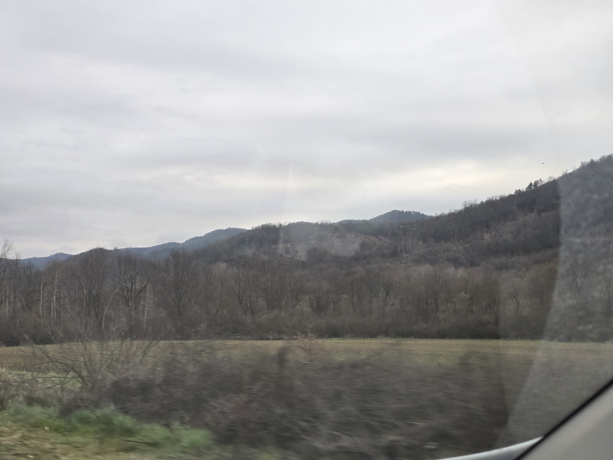The image depicts a rural landscape, possibly taken through a window. Overcast sky dominates the top portion of the frame. In the mid-ground, there are rows of leafless trees extending horizontally across the frame. Further back, rolling hills rise into mountains. The foreground consists of a field, possibly agricultural land, with brownish vegetation and some green patches visible near the bottom left. This landscape is potentially located in the city of Mikre, Bulgaria. No people, specific objects or actions are detectable.