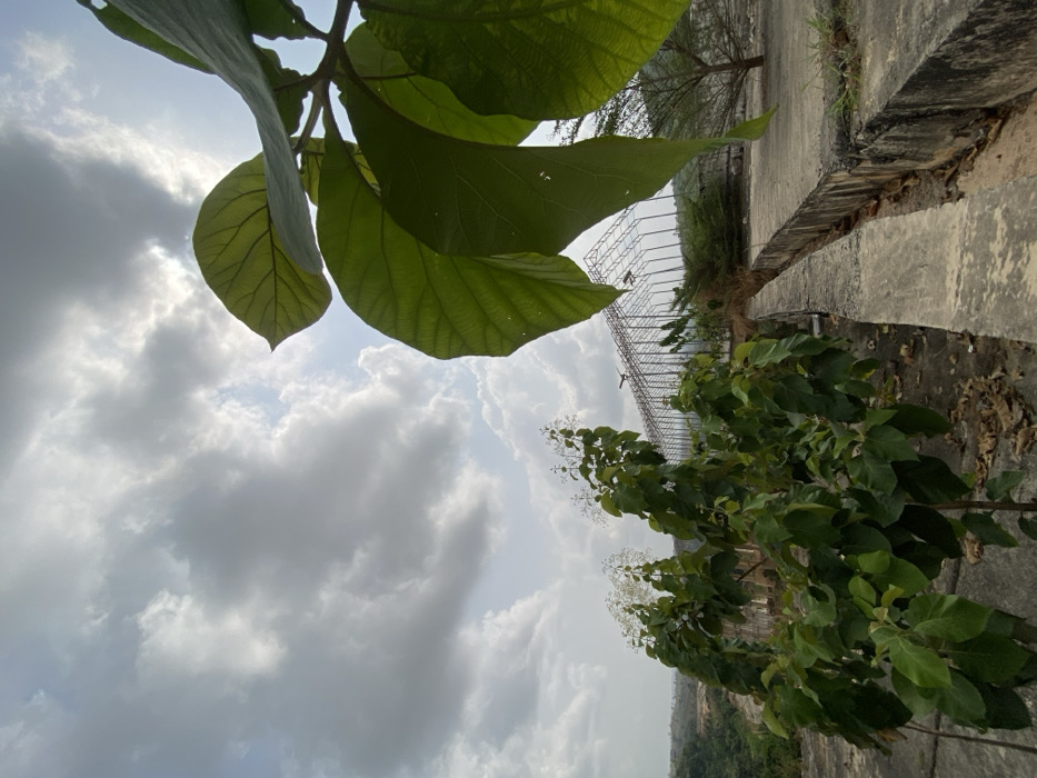The image displays an outdoor scene in Unwana, Nigeria, under a partly cloudy sky with diffuse sunlight visible in the upper right. Large, green, broad leaves partially frame the upper right foreground. In the midground, several smaller green trees and shrubs, some exhibiting white blossoms, stand on and near a concrete surface. A raised concrete pathway or channel extends from the mid-left towards the center-right. The background features a large, skeletal metallic structure with an arched framework, consistent with an unfinished building or greenhouse, stretching horizontally across the scene. Beyond this structure, a distant hilly landscape with sparse vegetation and exposed earth is discernible. No individuals or specific activities are observed.