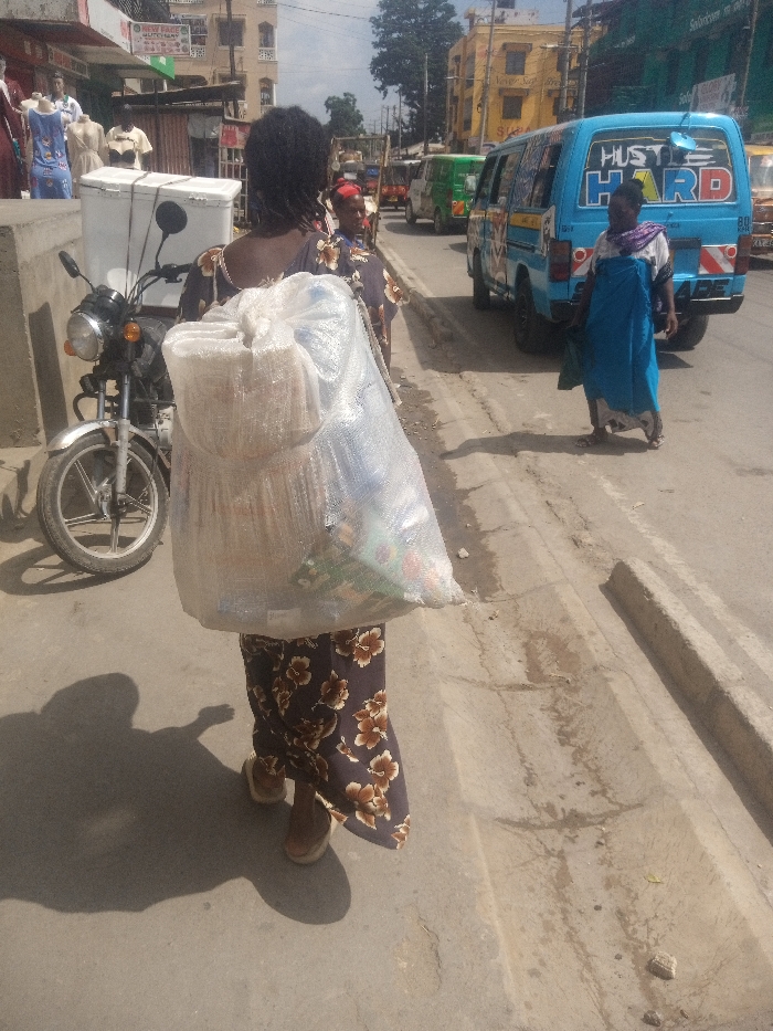 - "A woman carries a large plastic bag filled with goods while walking along a street" by FM-vsiag2, licensed under CC BY 4.0