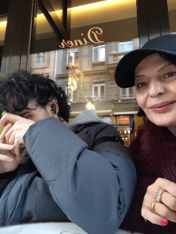 The scene depicts two individuals seated indoors at a "Diner," as indicated by the reversed "Diner" sign visible on the establishment's glass window. The location is in Strasbourg, France, with the window reflecting a typical European urban streetscape featuring multi-story stone buildings and additional shopfronts, including a partial reflection of "RIO" (likely Vapiano). On the right, an adult female with dark hair, wearing a black baseball cap and a dark red faux fur coat, is partially visible. Her left hand displays two gold-toned rings: one ornate ring with small stones on her index finger and a simpler band on her ring finger. She is looking directly towards the camera with a slight smile. On the left, a young adult male with dark, curly hair is seated. He wears a dark grey puffy jacket over a lighter grey hooded garment. A dark earbud is visible in his right ear. His face is turned away from the camera and obscured, with his hands clasped or intertwined near his face, resting on an indistinct light-colored object on the table. The interior is illuminated by an overhead yellow strip light, and reflections on the window suggest it is daytime, capturing the street beyond.