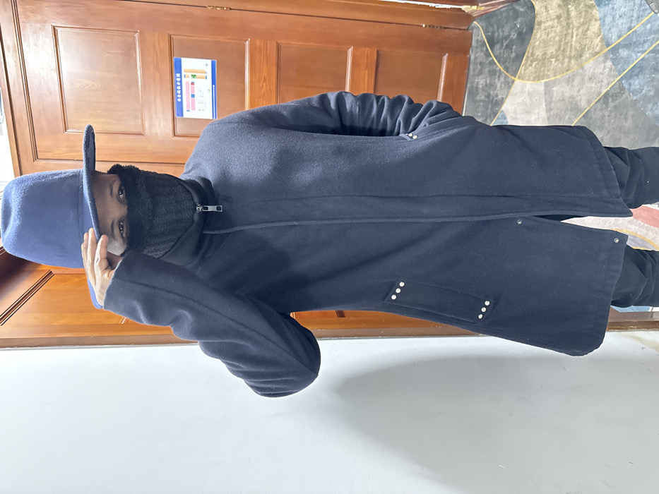 An individual, appearing as an adult male with a dark complexion, stands upright facing forward in an indoor setting. The person wears a dark blue felt fedora, a black knitted balaclava or neck gaiter covering the lower face and neck, and a dark navy blue mid-thigh length coat. The coat features a high collar, a partially visible zipper, and multiple white circular studs as embellishments on the left side and right pocket area. The individual's right hand is raised, touching the brim of the hat, while the left hand rests in the coat pocket. The background consists of a light-colored wall on the left, and two wooden doors to the right. An informational sign with Chinese characters, including "企业安全生产责任" (Enterprise Safety Production Responsibilities), and blue and white graphics is affixed to the right door. A patterned rug with abstract blue, grey, and beige shapes is visible on the floor in the lower right corner. The scene is located in Daxing District, China.