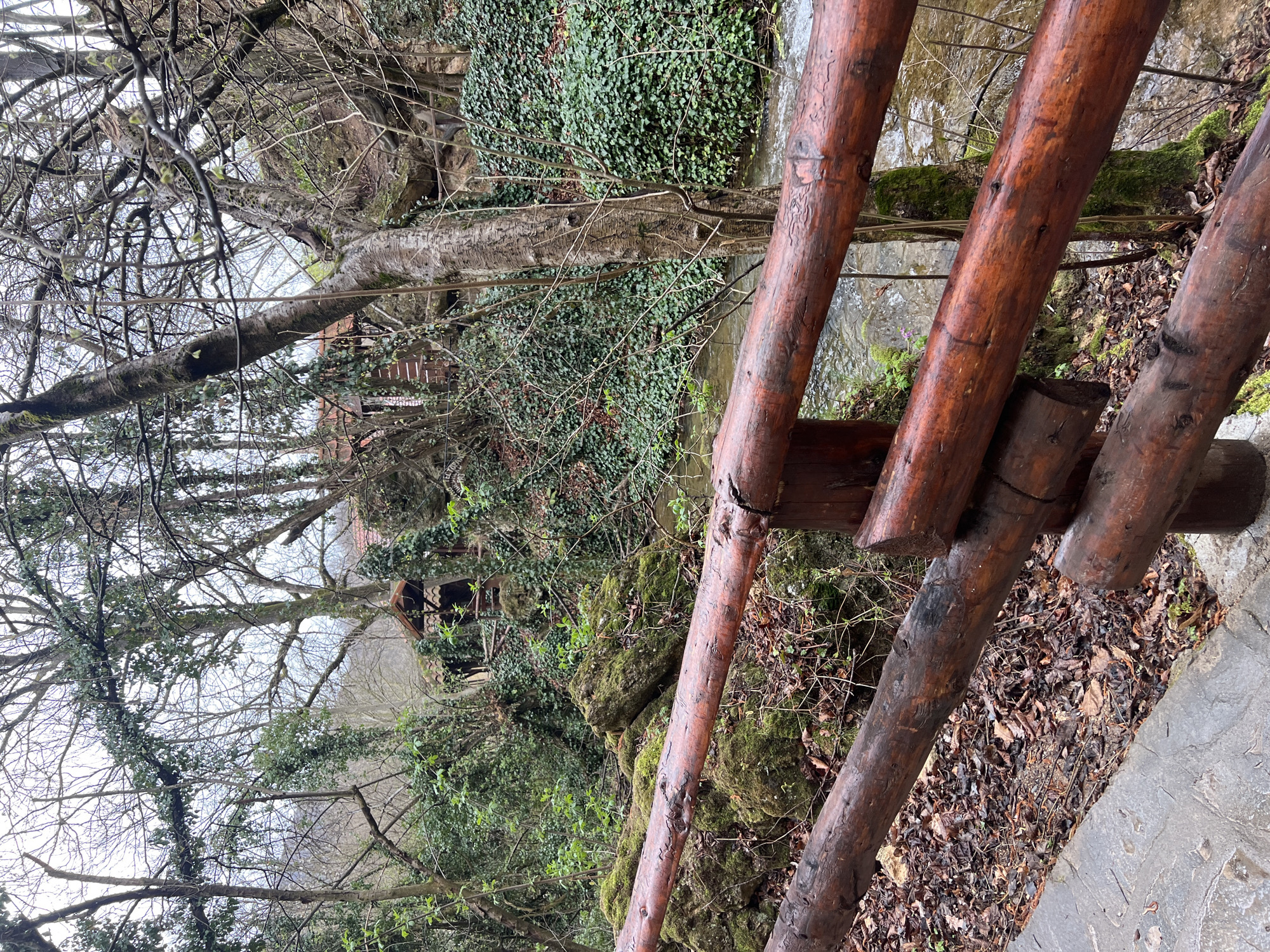 A forensic description of the image reveals a natural, forested environment within the Despotovac Municipality, Serbia. The scene is observed from a paved pathway, visible on the lower left, with a rustic, dark reddish-brown stained log railing occupying the foreground. Three horizontal logs form the visible section of the railing. Beyond the railing, a narrow stream with clear, flowing water is visible, running from right to left across the midground. The ground adjacent to the path and stream is covered with fallen brown leaves and moss-covered rocks. The stream banks are densely vegetated with green ivy and moss. The midground and background are dominated by a dense deciduous forest. Numerous trees, largely bare of leaves, are present, some exhibiting pale bark and early spring buds or sparse green foliage. Many tree trunks and branches are heavily entwined with vibrant green ivy. Nestled into the wooded hillside in the upper-midground, behind the stream and trees, are visible sections of two or more rustic wooden structures or cabins. These structures feature reddish-brown tiled roofs, and one distinct building possesses an exposed timber frame and an overhanging roof, resembling a gazebo or open-air shelter. The sky overhead is overcast and light, visible through the tree canopy. No individuals are present within the frame. The overall environment appears damp or recently wet.