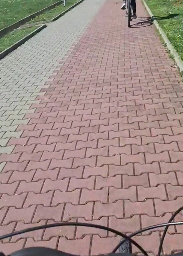first-person perspective of someone riding a bicycle on a paved path. The path is made of red and gray paving stones in a herringbone pattern. Another person is seen riding a bicycle ahead of the camera. The path is flanked by green grass and trees. The sky is blue with scattered white clouds. Two more people, also riding bicycles, pass in the opposite direction.