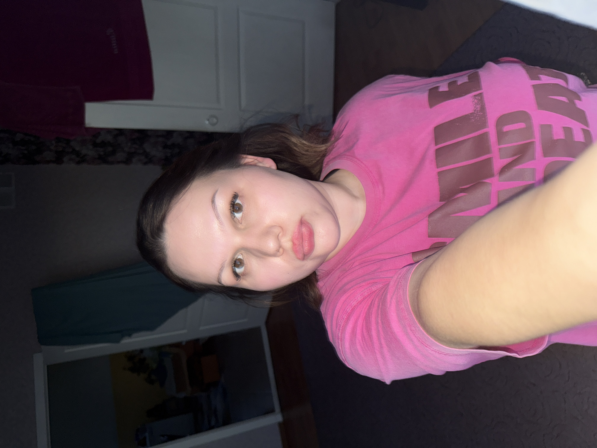 A forensic examination of the image reveals an interior scene within a residence in Chernushka, Russia. The primary subject is a female individual with medium-length brown hair, a light complexion, and light-colored eyes, looking directly into the camera. She exhibits applied eye makeup and lip product, with her lips pursed in a distinct pose. She is wearing a bright pink, short-sleeved t-shirt featuring dark, block-style lettering on the chest, partially visible as "MILE AND DEA". The subject is actively taking a selfie photograph, with her right arm extended into the frame, partially obscuring the lower right portion of the image. The background indicates an indoor environment with subdued lighting. A dark-colored carpet or rug covers the floor in the immediate foreground. To the left, an open doorway leads into an adjacent, dimly lit room, where a light-colored wall, some indistinct objects on a surface, and a draped light-blue textile are discernible. To the right, a white door with a visible circular doorknob is closed. Above and to the right of this door, a dark red textile, possibly an article of clothing or a towel, hangs against a wall. A dark, patterned curtain or fabric is also visible on the upper right portion of the background wall.
