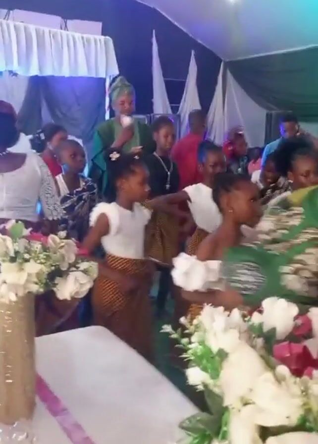 group of people dancing and moving in a room decorated with flowers and draped fabric. There are several children, some wearing matching outfits, dancing in the center of the crowd. Adults are interspersed among them, some also dancing and others watching. The room is lit with colored lights, and there is a white tablecloth visible in the foreground with flower arrangements on it. Someone in the crowd is holding a phone and taking a photo or video.