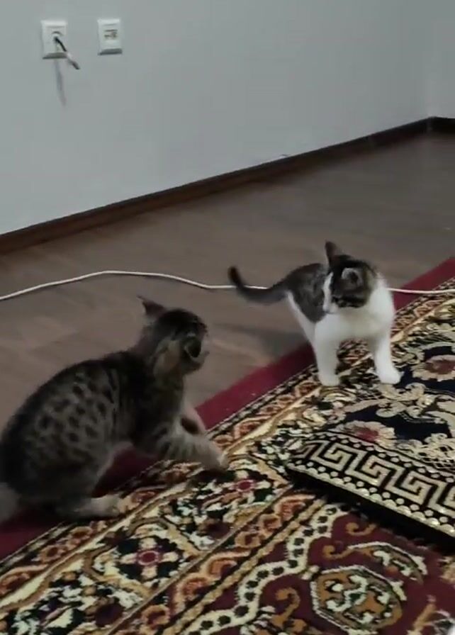 Two kittens, one with a tabby coat and the other with a white and black coat, interact with each other on an ornate patterned rug placed on a wood floor near a wall. The tabby kitten walks on the rug while the black and white kitten initially stands. A white electrical cord runs along the baseboard, and there are electrical outlets visible on the wall. The kittens move around a light-colored table with wooden legs that partially blocks the view. A voice is heard in the background speaking in a language other than English.