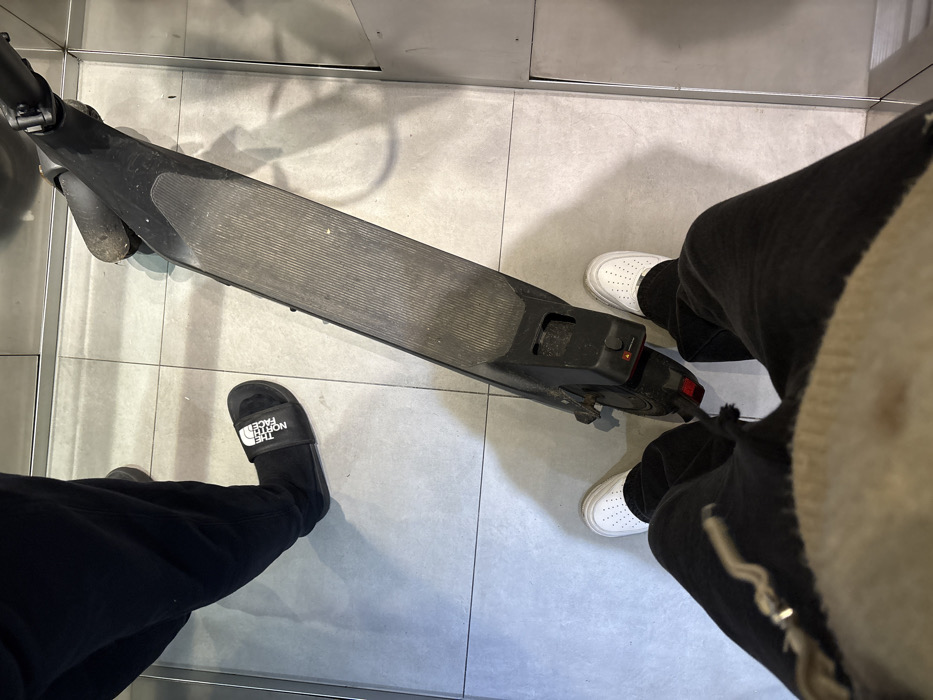 A high-angle shot shows an electric scooter positioned between two people on a tiled floor. The person on the left wears black sweatpants and a black North Face slider with socks. The person on the right wears black jeans and white sneakers. The scooter is black and dusty, with visible wear on its deck. The background suggests an indoor setting with metal accents.