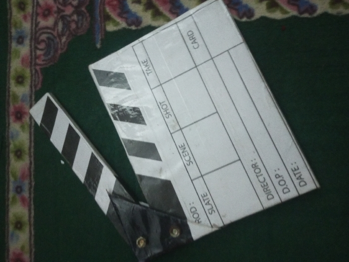 - "A movie slate rests diagonally on a dark green surface, partially overlaid by a patterned rug in the upper left corner" by FM-Z7eLi1, licensed under CC BY 4.0