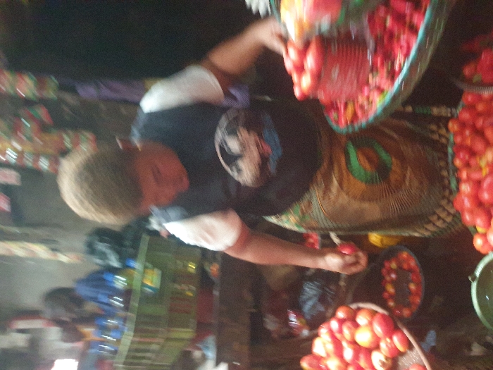 This image depicts an indoor market scene within Nkpor, Nigeria. In the foreground, a person with short, light brown hair is bent forward, looking downwards, interacting with produce. They wear a dark sleeveless top over a white short-sleeved shirt, featuring a circular graphic on the dark layer. Below, they wear a patterned wrapper or skirt with brown, gold, green, and blue motifs. Their right hand is positioned over a dark, circular tray containing numerous red tomatoes, holding a single red tomato. The immediate surroundings are densely packed with produce. To the left, a large, round basket overflows with red tomatoes. Below and slightly to the left, a green bucket or bowl also contains tomatoes. To the right, a multi-tiered stand displays an abundance of red items; the upper tier holds larger red tomatoes, while lower tiers feature smaller, brighter red produce, likely peppers or small tomatoes. In the blurred background, a green plastic crate on a counter holds several bottles with blue caps. Behind this, another individual in a blue garment is partially visible on the far left. The overall environment appears to be a busy, somewhat cluttered market stall with muted lighting, and various items, including colorful packaging, are suspended or stored in the background.