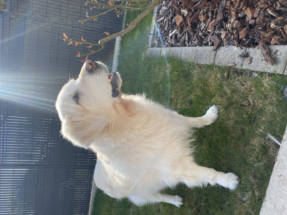 - "A light-colored Golden Retriever dog stands on a well-maintained green grass lawn in a residential backyard in Truchtersheim, France" by FM-3x3sP2, licensed under CC BY 4.0