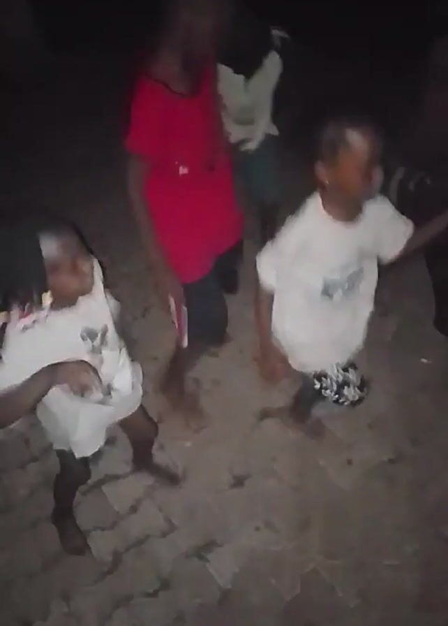 multiple children dancing in a sandy outdoor space at night. The children wear casual clothing, including t-shirts and shorts, and are barefoot. The lighting is dim, making details hard to see. The camera moves around while recording, focusing on the children dancing.