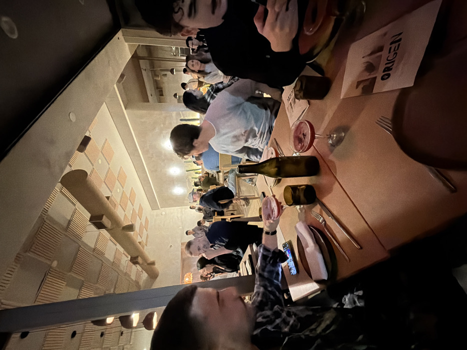 A restaurant scene shows diners seated at tables. A long, rectangular table dominates the view with place settings, including plates, cutlery, and glassware. A wine bottle rests near a cocktail glass with a pink liquid. A menu with the word "ORIGEN" is also visible. The restaurant features textured wall decor, including a large cylindrical object hanging from the ceiling. People of various ages are present, mostly with their backs to the camera.