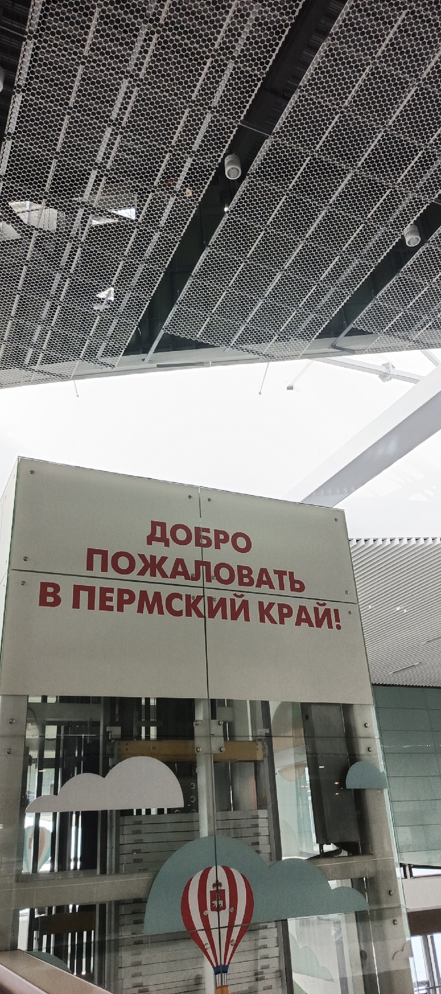 The image displays an interior scene at Perm International Airport in Bolshoye Savino, Russia