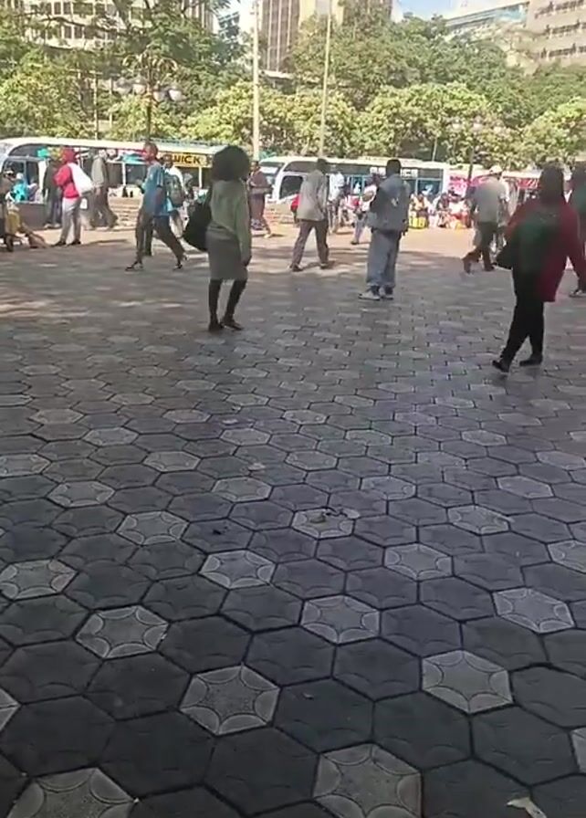 public area with a hexagonal-patterned pavement, likely a plaza or transportation hub, based on the presence of buses and the flow of pedestrian traffic. People of various ages and appearances are walking through the area. Some are standing in small groups near what looks like a bus stand. A sign for "ZETECH UNIVERSITY" is visible in the background. The buildings in the background suggest an urban setting, and the lighting indicates it is daytime.