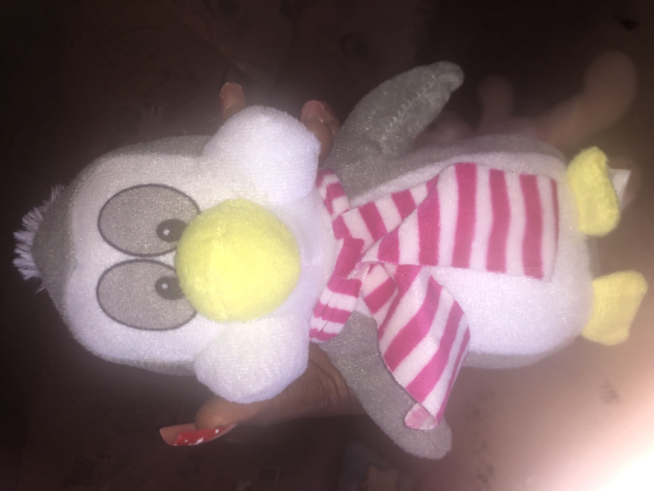 A plush toy resembling a penguin is centrally depicted, held vertically by a person's hand in Rido, Nigeria. The penguin toy features a white chest and face, grey back and wings, a yellow beak, and yellow feet. Its eyes are large, grey-outlined ovals with black pupils. A small white tuft of material is present on top of its head. The toy wears a pink and white horizontally striped scarf tied around its neck. A dark-skinned hand holds the toy from behind and to its left. Two fingers of this hand are visible, featuring long, pointed fingernails painted red with white polka dots. The background is dark, out of focus, and indistinct, showing faint, blurry shapes. The scene is illuminated by what appears to be a direct light source, creating reflections and slight lens flare.