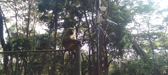 - "The image depicts a baboon perched atop a vertical metal fence post in a natural, tree-dense environment within Athi River ward, Kenya" by FM-RR35N2, licensed under CC BY 4.0