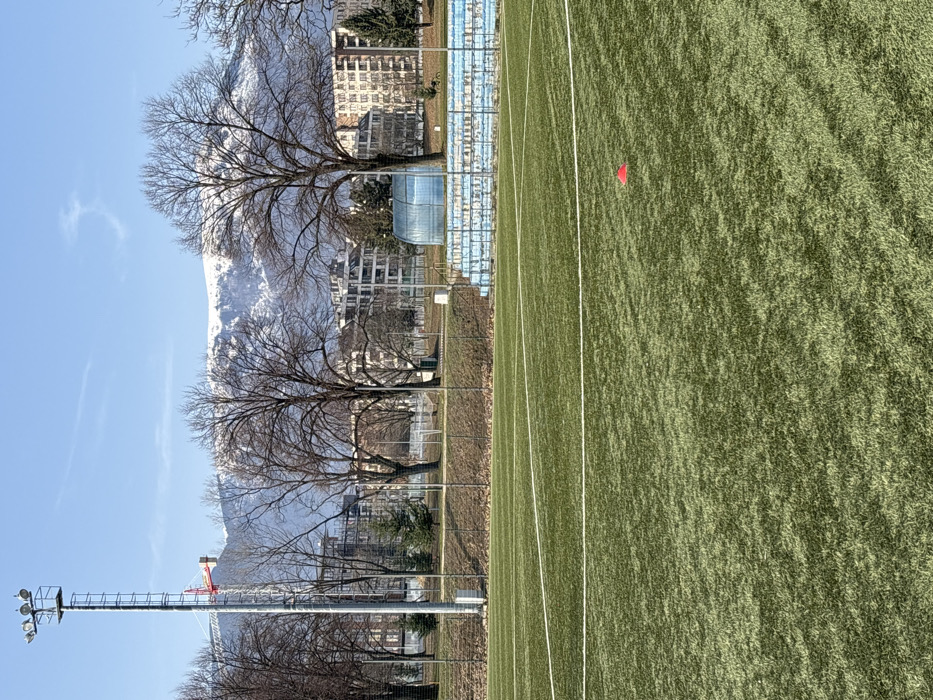 The image depicts an artificial turf sports field, likely a football pitch, under a clear blue sky. In the foreground, white lines delineate a section of the green turf, and a single red conical training marker rests on the field towards the lower right. The midground features a low earthen embankment topped by a metal fence. Behind this fence, a series of light blue, multi-row bleachers are visible, appearing aged or weathered. To the right of the bleachers, a small, translucent blue, barrel-vaulted structure is present. Numerous deciduous trees with bare branches are scattered across the midground, suggesting a late winter or early spring season. Behind these trees, various multi-story urban buildings, including modern apartment blocks and potentially some under construction, are visible. On the far left, a tall metal floodlight tower with a cluster of lamps at its apex stands prominently, with a red and white construction crane partially visible behind it. The background is dominated by a large, snow-capped mountain range, consistent with Vitosha Mountain, which stretches horizontally across the scene. This mountain range, combined with the urban environment and the general appearance, indicates the location is in or near Sofia, Bulgaria. The scene is devoid of people or active engagement.