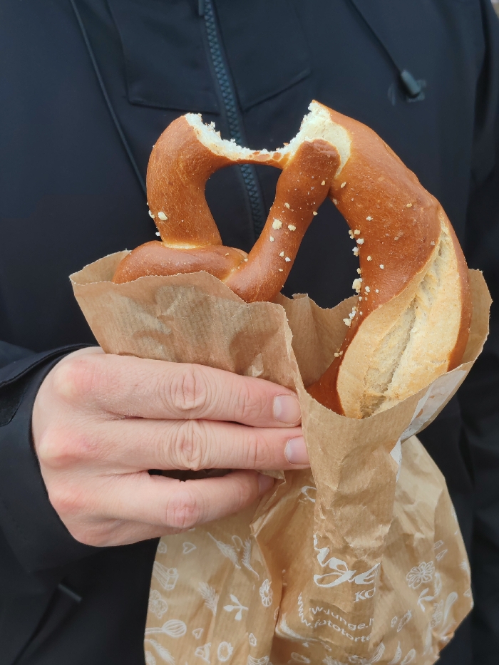 - "A close-up, chest-level shot in Riga, Latvia, depicts a person's hands holding a large, golden-brown pretzel in a light brown paper bag" by FM-pQX6Q2, licensed under CC BY 4.0