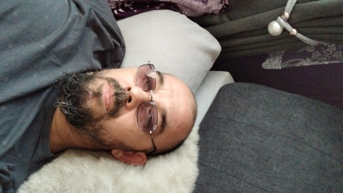 The image depicts an adult male in an indoor setting. The specific location within the city of Levski, Bulgaria, cannot be determined from the visual evidence provided. **People:** One adult male, appearing to be middle-aged, is positioned in the foreground, facing directly towards the camera. He has light skin, a receding hairline, and short dark hair on the sides of his head. He wears square-framed glasses with slightly tinted lenses. A dark, full beard and mustache are present, showing some grey hairs, particularly around the chin. His lips are closed in a neutral expression. **Subjects/Objects:** The man is wearing a dark grey, short-sleeved t-shirt. He appears to be reclining or lying down, with his head resting on a light-colored, possibly off-white, soft cushion or pillow. To the right of his head, a section of a white, shaggy fur-like throw or pillow is visible. Behind him, to the left, a dark green or grey curtain is visible, gathered by a decorative tie-back featuring silver-colored woven material, a silver ring, and a large, smooth, spherical pearl-like object. Further to the left and upper background, a dark patterned fabric (possibly part of another curtain or upholstery) is partially visible. A plain dark grey upholstered surface, likely part of a sofa or bed, is visible behind and to the right of the man. A sliver of white, possibly an armrest or base of furniture, is present below the grey upholstered surface. **Actions/Interactions:** The man is posing for a photograph, likely a selfie, as indicated by his direct gaze into the camera and the close-up framing. No direct interaction with other individuals or objects within the frame is depicted. **Environment:** The scene is an interior room, characterized by soft furnishings, indicating a domestic or private setting such as a living room or bedroom. Lighting appears ambient and even, suggesting indoor artificial light or diffuse natural light.