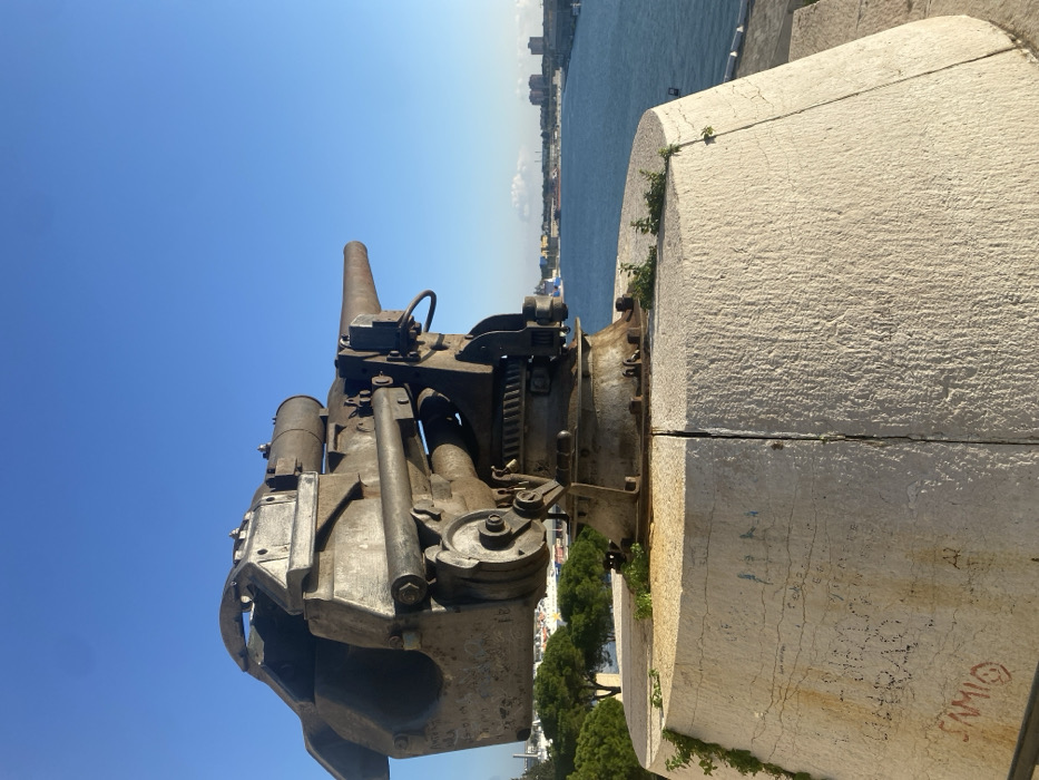An antique metal cannon stands on a weathered, white stone base. The cannon's complex mechanics are visible, including gears and cylinders, all showing signs of age. In the background, the sea meets a distant coastline with buildings. The clear blue sky above contrasts with the aged texture of the cannon and its mounting. Some graffiti is visible on the side of the stone base.