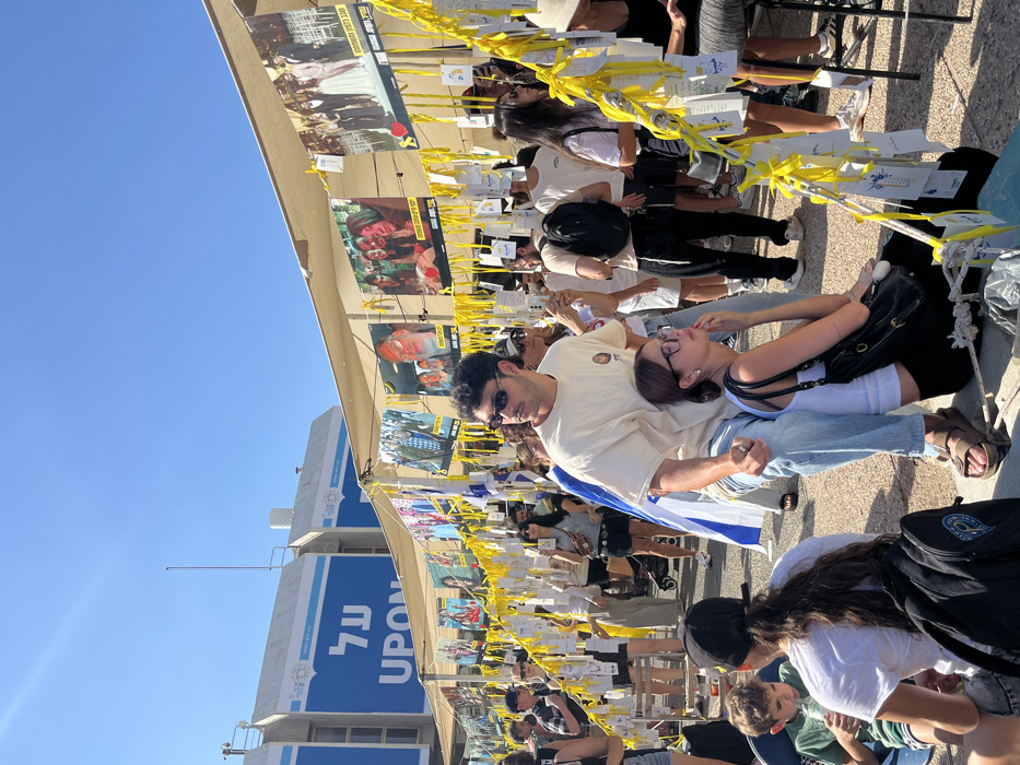 The image captures an outdoor gathering under a clear blue sky in Tel Aviv, Israel, in front of the Tel Aviv Museum of Art and Habima Square complex. A large multi-story building, displaying blue sections with the Hebrew word "על" and English "UPON," along with the emblem of the State of Israel, forms the background. A temporary canopy structure stretches across the scene, heavily decorated with numerous printed photographs of individuals, yellow ribbons, and small white paper notes. In the immediate foreground, a young adult male with dark curly hair, wearing a cream t-shirt, light blue jeans, and dark sunglasses, stands, looking towards the left. He is positioned in front of a young adult female with dark hair and glasses, wearing a white tank top and black pants, who is seated on the paved ground, looking upwards and to the right. She carries a black shoulder bag. To their left, another individual with long dark hair, wearing a white t-shirt and a dark backpack, sits on the ground, facing away from the viewer, adjacent to a young boy in a green t-shirt holding a bottle. Throughout the midground and background, a large crowd of diverse individuals is visible, either standing, walking, or observing the displayed items. One person in the midground has an Israeli flag draped over their shoulders. Another male figure in the mid-right wears a dark t-shirt, dark pants, and a dark yarmulke. The ground is paved with light-colored material.