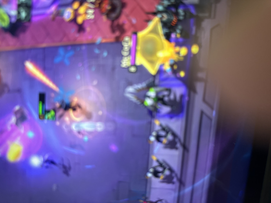 video game scene with numerous cartoon characters battling in a futuristic setting. The scene is dominated by vibrant colors and a purple and blue haze. Several characters are engaged in combat, attacking and defending against one another. The characters are mostly blurred, making it difficult to discern specifics. The scene is lit by bright, glowing effects. The scene is taking place on a virtual game platform. The coordinates provided, 10.366 latitude and 107.1 longitude, place the location in Vũng Tàu, Vietnam.