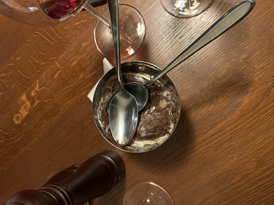 An overhead view captures a dining scene on a warm-toned wooden table. In the center-lower portion of the frame, a metallic bowl contains partially consumed and melted chocolate ice cream, with white and brown streaks. Two silver-colored spoons are positioned within the bowl; one spoon is largely covered in ice cream residue, while the other appears cleaner. To the upper left, a dark brown, possibly wooden, pepper or salt mill is partially visible. To the right of the bowl, the stems and bases of two clear glass wine glasses are present. One glass contains a small quantity of red liquid, while the other is empty. A folded white napkin is visible beneath the metallic bowl. The wooden table surface exhibits a distinct grain pattern. The objects suggest a restaurant or cafe setting. No identifying visual information is present within the image to determine a specific location in the city of Dnipro, Ukraine.