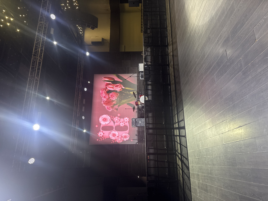 The image displays an indoor event venue, possibly a concert hall or club, located in Khimki, Russia. The precise address within Khimki is not discernible from the provided visual data. The scene features a stage viewed from the audience floor, which is composed of dark, wide plank flooring. A black metal crowd control barrier separates the stage from the empty audience area. The stage is equipped with a large LED screen displaying a pink-themed graphic: a stylized "8" (eight) and a "В" (Ve, resembling the first letter of "March" in Russian) adorned with paper-cut flowers, alongside a vibrant bouquet of pink roses and tulips. This imagery suggests an event related to International Women's Day (March 8th). Musical equipment is positioned on the stage, including a red drum kit, at least one black guitar amplifier, and multiple microphone stands. The stage background on either side of the LED screen consists of dark, textured panels. Above the stage, a metallic truss system supports numerous bright stage lights, with light flares visible in the upper portion of the image. Large black speaker arrays are suspended from the ceiling on the right side of the stage. The ceiling in the background on the right features decorative lighting or metallic accents. The overall environment is illuminated by the stage lights, casting shadows from the crowd barrier onto the floor. No people are visible within the frame.